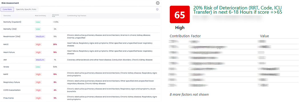 Interfaces showing predictions to end-users are pretty standardized. There’s an outcome, like an adverse event like hospitalization or onset of disease, and a patient score, which comes from the model. With with each score, there’s a list of “features” (also called variables, predictors, or factors) that were determined to be important to the model - the so-called “contributing factors” to the prediction.